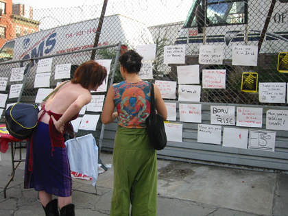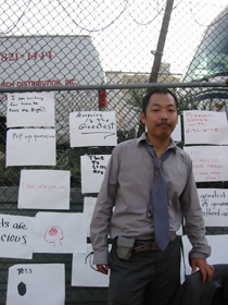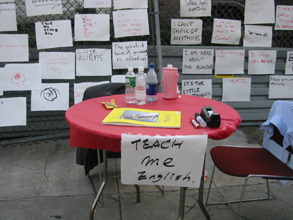 チェルシー主催のパフォーマンスフェアーに参加した時に行なったパフォーマンス。 出来るだけ英語での会話を避け、書いてもらった文を読んでもらい、その内容を細かく英語で説明してもらった。 このパフォーマンスを思いついたのは3年前に始めてNYに来た時で、パフォーマンスと英語の勉強が無料でできる一石に二鳥のパフォーマンスになった。 子供は単語だけ教えてくれたり、偏った思考の人や、本当に役立つ英語を教えようとする人などバリエーションに富んだ文面が並んだ。 |