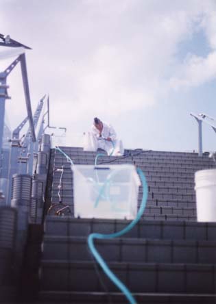 | 東京湾から400メートル離れた会場に、呼吸によって海水を引き込む。 高低差14メートル。 各ステップに合わせて15カ所程に分けて吸い上げる。 開始数分で口から出血。 海容とは全てを許す気持ちといった意味があり、新交通ゆりかもめから見る海面は何事も無いほどゆったりと日を浴びてきらめく、しかし波打ち際に立って見る海水の色は、濁った青緑した遊泳さえままならない状況だ。 その海水を、展覧会を見に来る観客に見せる事で、私達の行為が自然に許され続けるのか、考えてもらえる機会になればと思う。