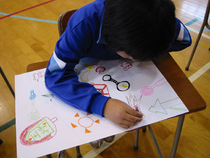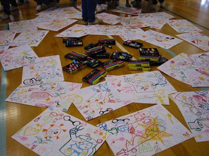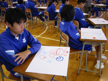 make a circle, and draw a picture. 2001 participant:junior high school student place:Shibayama junior highschool, HIBA address: time:Two hour number of people: 114 assistant:2 planning:Yoko Uno material:drawing paper.pen.colored pencil |
