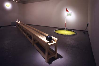 | コミュニケーションを扱かった作品で、今まではポジティブな関係性を取り入れてきたのですが、この作品ではスポーツを通して身の回りで常に行われる優劣の判断基準を失わせようとしてみました。 知識、暴力、技術など優劣を見定めるカテゴリーは色々あるし、誰しもこういった考え方にたいして不本意だと感じているのでは無いだろうか。 この展覧会で用意された作品は全て一等賞だったり、同じスコアーになるように既存のゲームに手を加えて製作してあります。 1、パーフェクトボーリング 一見、誰しもハイスコアーを出せたらこんな楽しい事はなさそうなのですが、比べる尺度を取り払うと本当にそれは幸せな世界なのでしょうか?きっと新しいルールをそこから作りだし僕らは競争を始めるのでしょう。